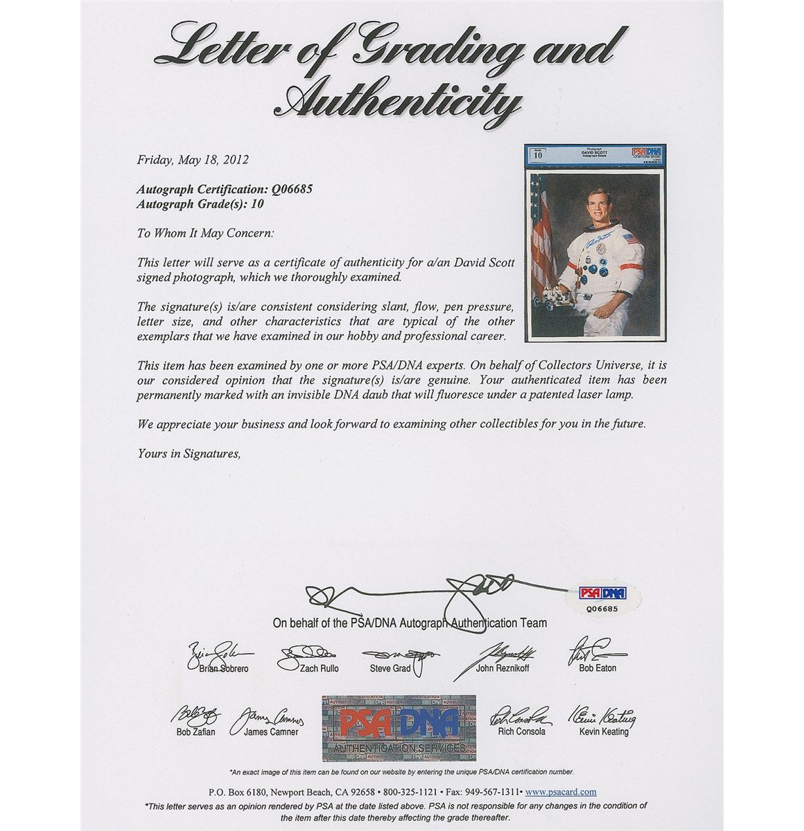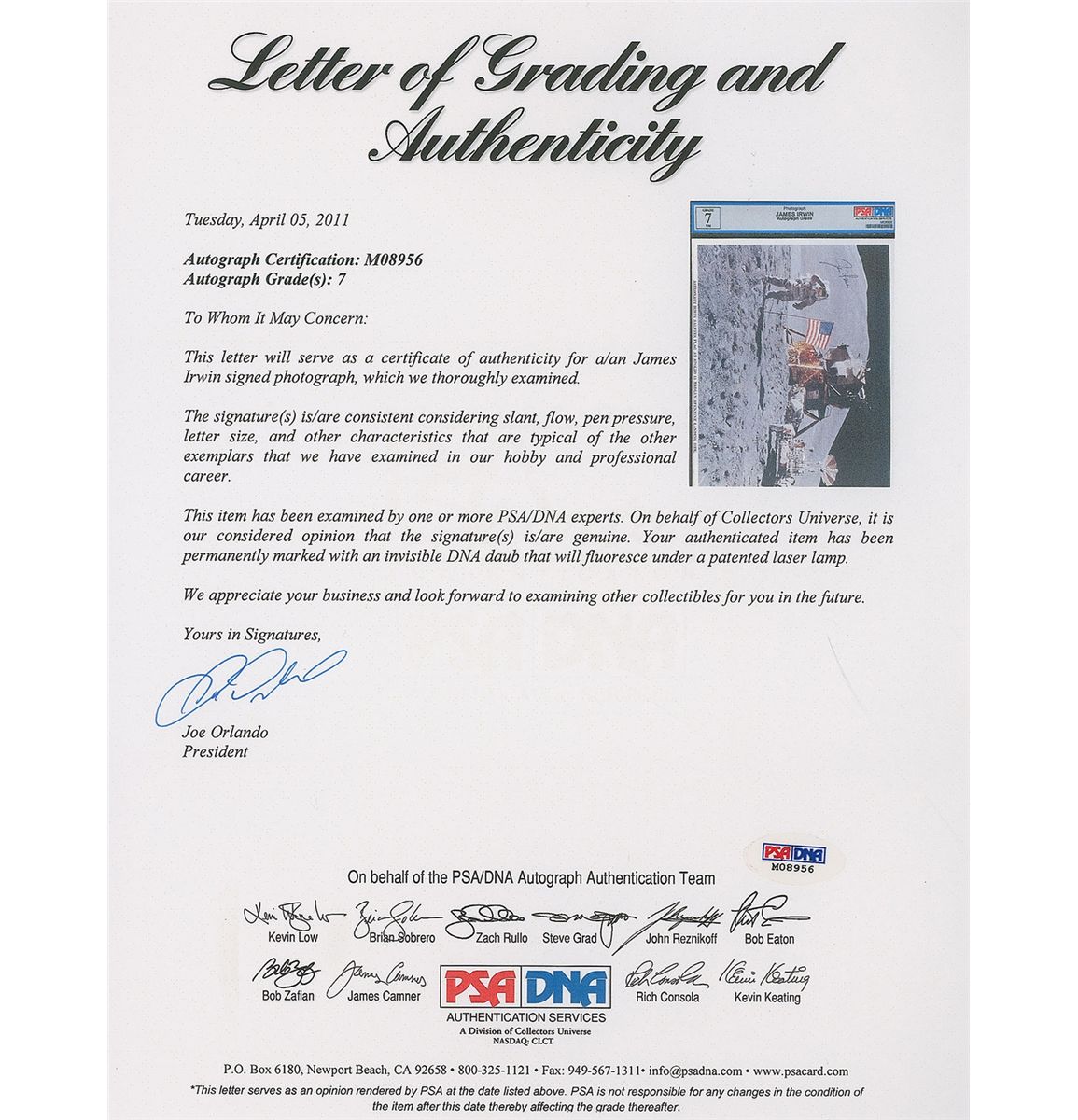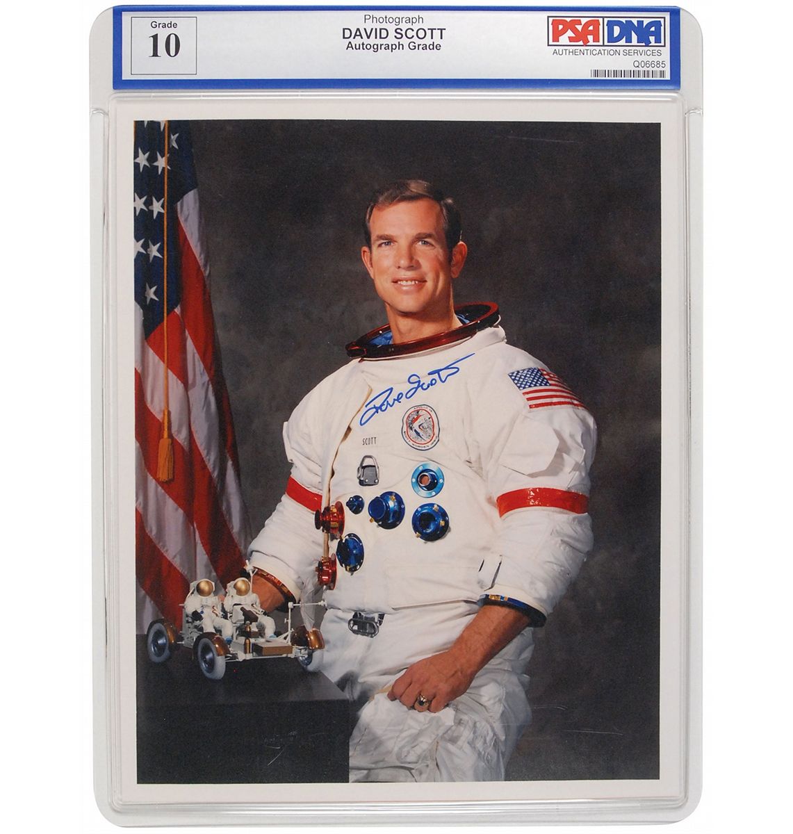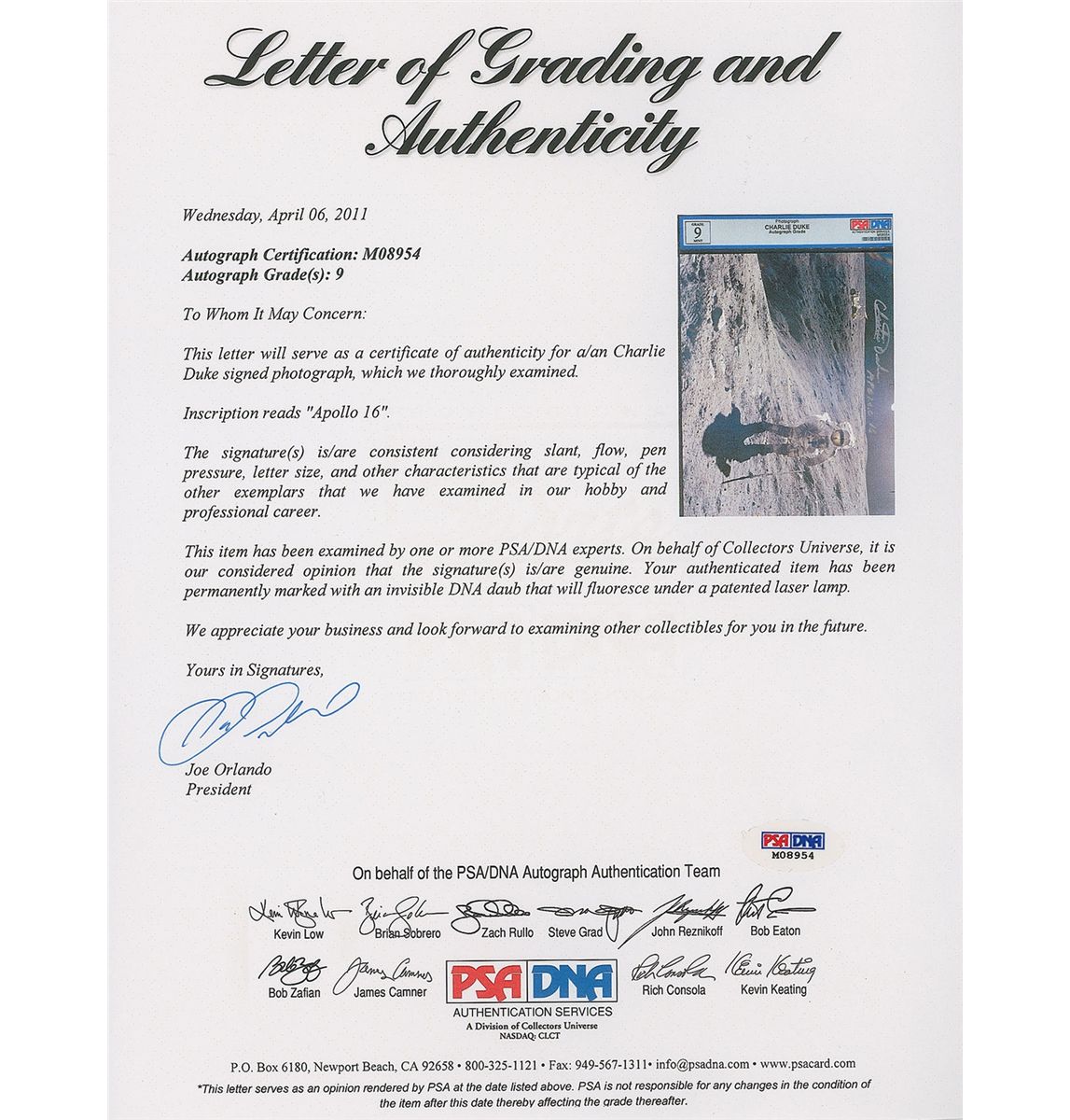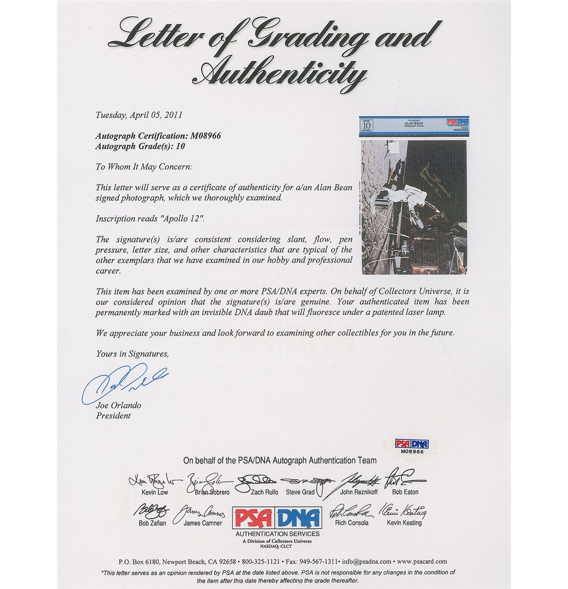 Extraordinary collection of 12 color photos representing each moonwalker, all measuring 8 x 10 or 10 x 8, each signed in felt tip or ink by the astronaut pictured. All are encapsulated in plastic PSA/DNA authentication and grading holders, evaluating just the autographic grades. Signers are: Neil Armstrong (NASA lithograph, graded "4"), Buzz Aldrin (glossy NASA 'red numbered' photo, graded "10"), Alan Bean (NASA lithograph, graded "10"), Charles Conrad (NASA lithograph, graded "8"), Alan Shepard (matte-finish photo, graded "10"), Edgar Mitchell (satin-finish photo, graded "10"), Dave Scott (satin-finish photo, graded "10"), Jim Irwin (NASA lithograph, graded "7"), John Young (satin-finish photo, graded "10"), Charlie Duke (satin-finish photo, graded "9"), Harrison Schmitt (NASA lithograph, graded "9"), and Gene Cernan (satin-finish photo, graded "10"). In overall fine condition, with a few light bends and creases to the Armstrong photo. All photos are also accompanied by full letters of authenticity from PSA/DNA. An exceptional collection of the dozen men to set foot on the moon, infrequently offered as a complete set and in such fine condition.