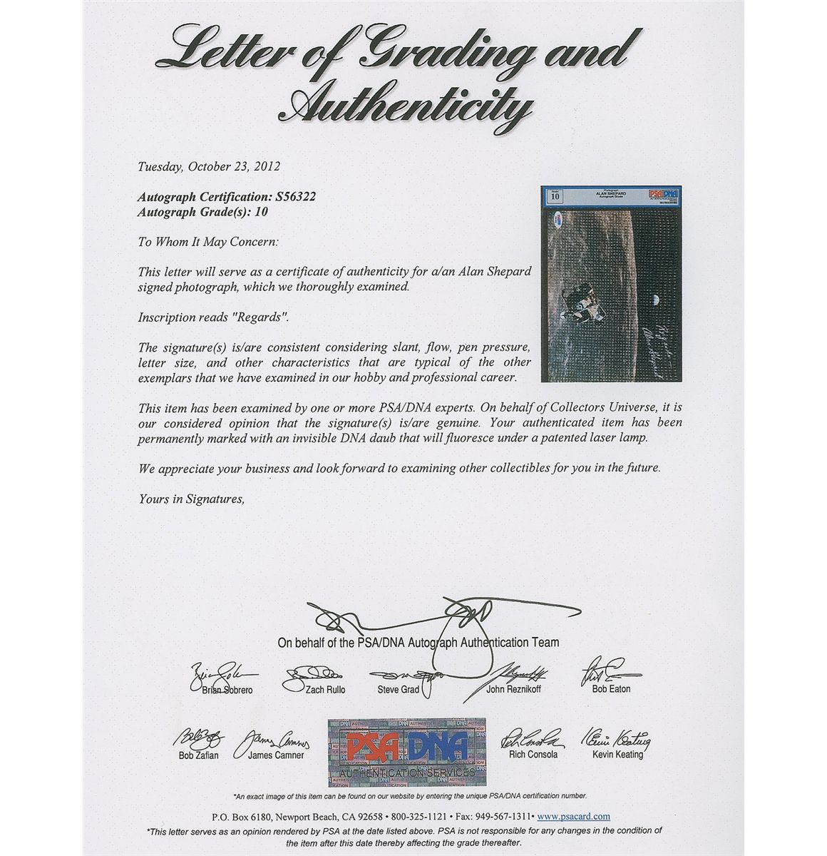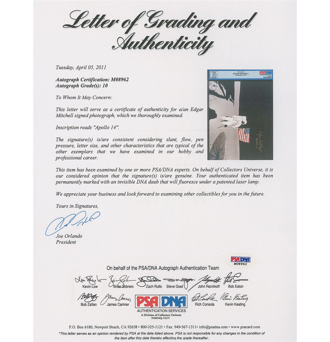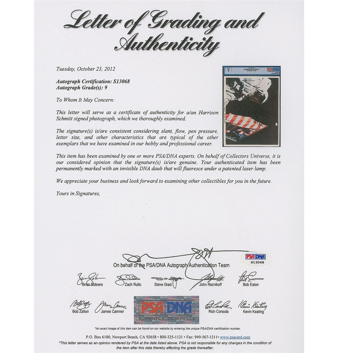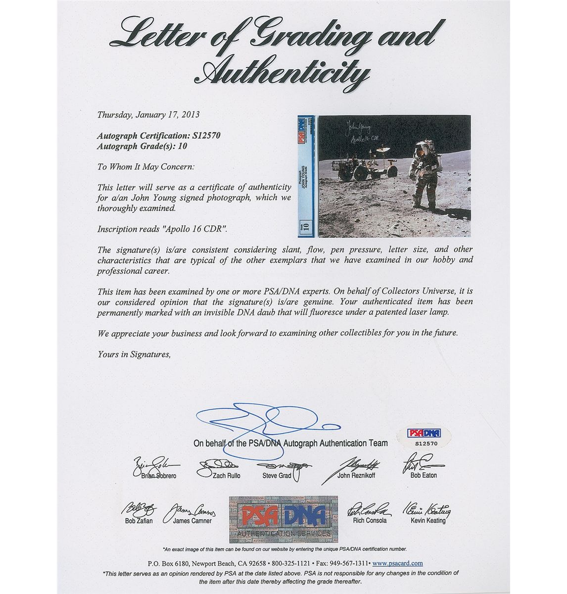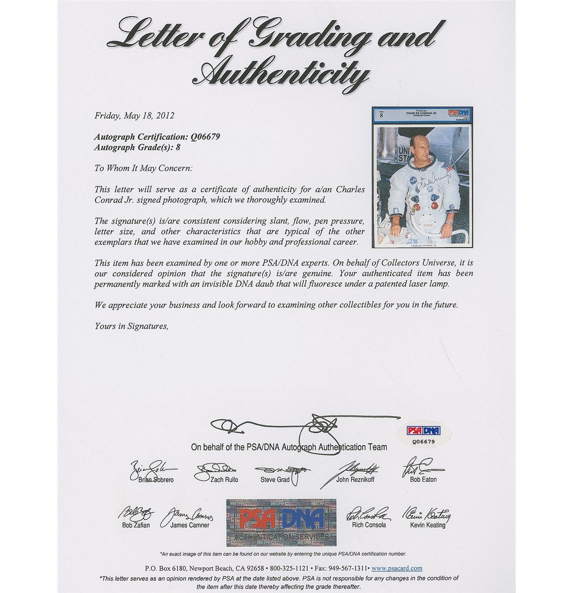 Extraordinary collection of 12 color photos representing each moonwalker, all measuring 8 x 10 or 10 x 8, each signed in felt tip or ink by the astronaut pictured. All are encapsulated in plastic PSA/DNA authentication and grading holders, evaluating just the autographic grades. Signers are: Neil Armstrong (NASA lithograph, graded "4"), Buzz Aldrin (glossy NASA 'red numbered' photo, graded "10"), Alan Bean (NASA lithograph, graded "10"), Charles Conrad (NASA lithograph, graded "8"), Alan Shepard (matte-finish photo, graded "10"), Edgar Mitchell (satin-finish photo, graded "10"), Dave Scott (satin-finish photo, graded "10"), Jim Irwin (NASA lithograph, graded "7"), John Young (satin-finish photo, graded "10"), Charlie Duke (satin-finish photo, graded "9"), Harrison Schmitt (NASA lithograph, graded "9"), and Gene Cernan (satin-finish photo, graded "10"). In overall fine condition, with a few light bends and creases to the Armstrong photo. All photos are also accompanied by full letters of authenticity from PSA/DNA. An exceptional collection of the dozen men to set foot on the moon, infrequently offered as a complete set and in such fine condition.