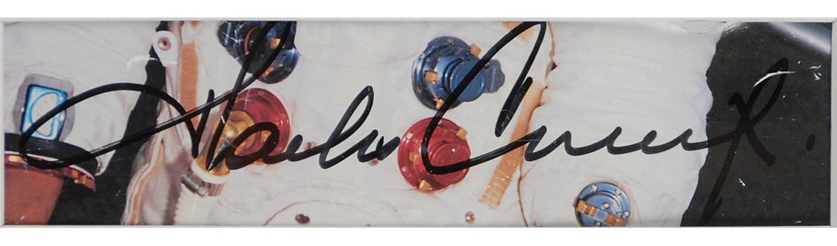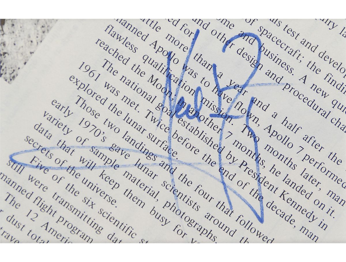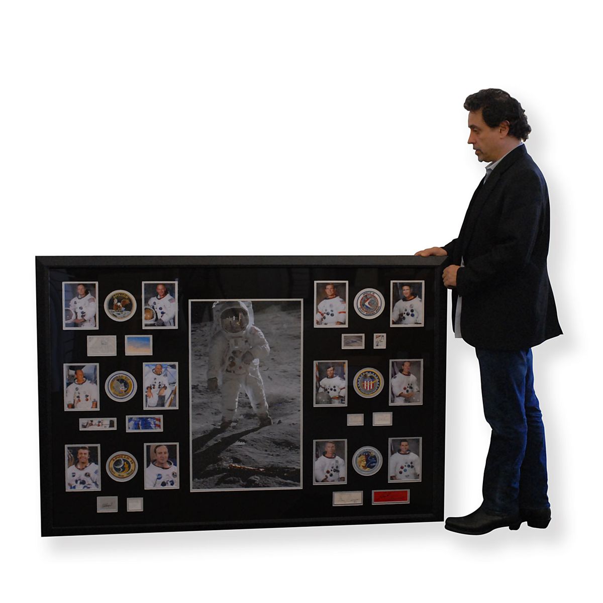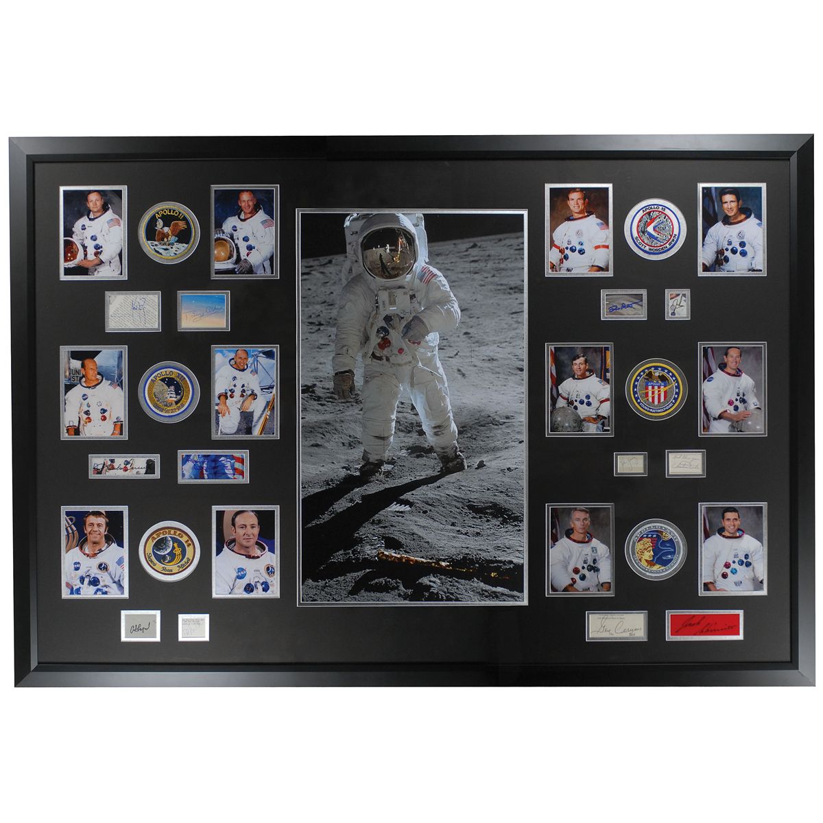 Impressively displayed collection of ink signatures of all 12 moonwalkers: Neil Armstrong, Buzz Aldrin, Charles Conrad, Alan Bean, Alan Shepard, Edgar Mitchell, Dave Scott, Jim Irwin, John Young, Charlie Duke, Gene Cernan, and Harrison Schmitt, clipped from a variety of formats including photos, books, cards, and programs. All signatures are grouped together by mission and impressively double-matted and framed with color photos of each moonwalker, their respective mission patch, and a large color poster of Buzz Aldrin on the lunar surface, to an overall size of 65 x 44. In overall fine condition, with tape over the top and bottom of Young’s signature. Oversized.