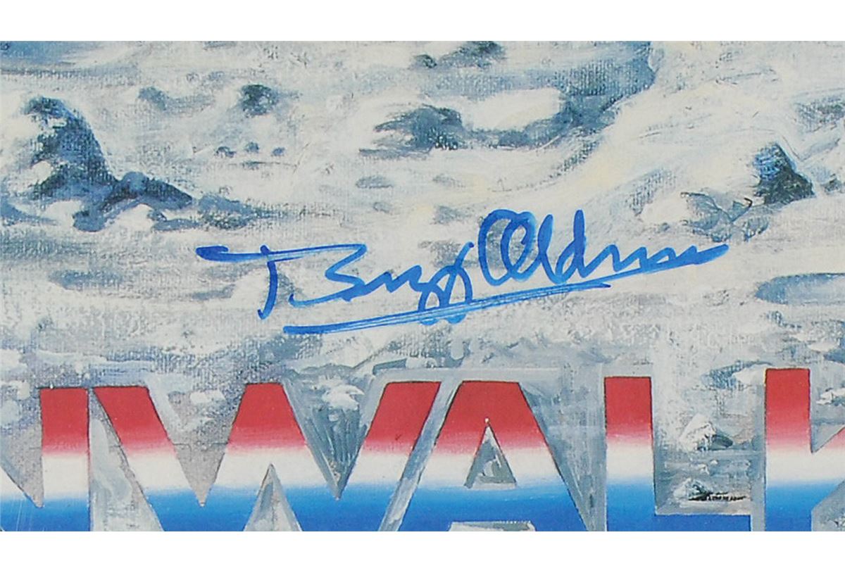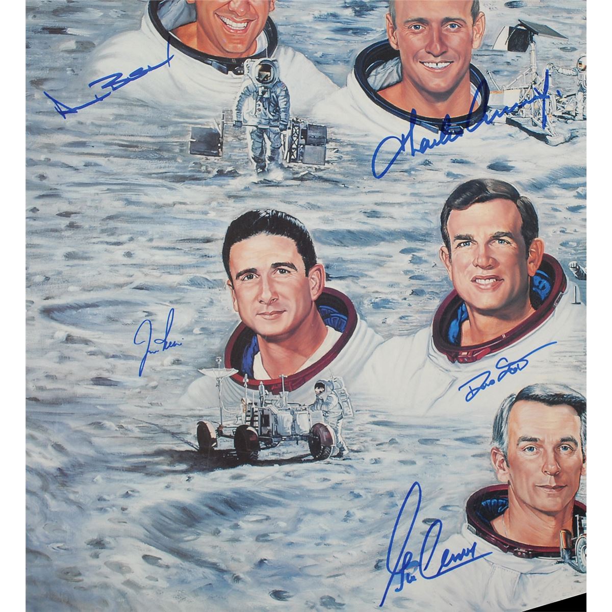 Color limited edition 31 x 25 print entitled ‘Moonwalkers,’ numbered 538/1000, signed in blue felt tip by eleven of the twelve men to walk on the lunar surface: Buzz Aldrin, Alan Bean, Charles Conrad, Alan Shepard, Edgar Mitchell, Dave Scott, Jim Irwin, John Young, Charlie Duke, Gene Cernan, and Harrison Schmitt. Also signed in blue felt tip by the artist, Ron Lewis. Rolled and in fine condition, with light edge dings and creases. A visually impressive and highly desirable piece signed by these iconic astronauts.