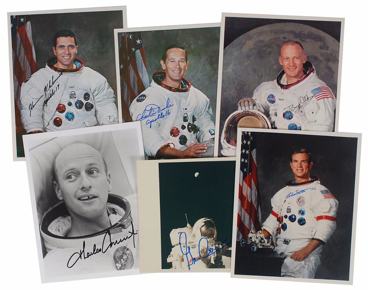 Appealing set of six photos of various moonwalkers, three of which are official NASA lithographs, ranging in size from 8 x 10 to 10 x 8, each signed in ink or felt tip by the astronaut pictured, including: Buzz Aldrin, Charles Conrad, Gene Cernan, Dave Scott, Charlie Duke, and Harrison Schmitt. In overall fine condition, with a Spacesource label affixed to the reverse of the Scott photo. The Leon Ford Collection.