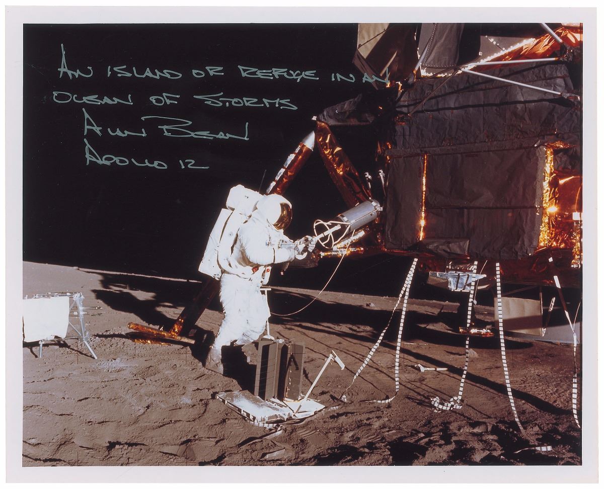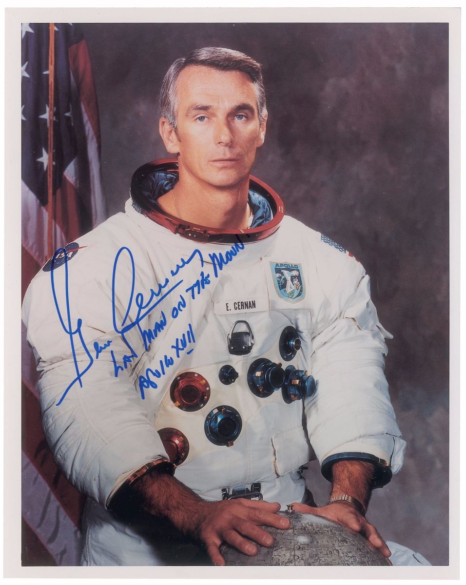 Complete set of signed photos of all twelve moonwalkers, 8 x 10 and 10 x 8, including: Neil Armstrong (inscribed NASA lithograph), Buzz Aldrin, Alan Bean, Charles Conrad, Alan Shepard, Edgar Mitchell, Dave Scott (NASA lithograph), Jim Irwin (NASA lithograph), John Young, Charlie Duke, Gene Cernan, and Harrison Schmitt (inscribed NASA lithograph). In overall fine condition, with some creasing and rippling to the Schmitt litho.