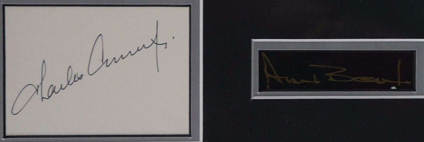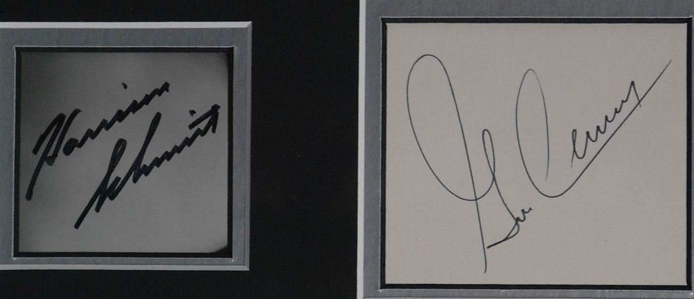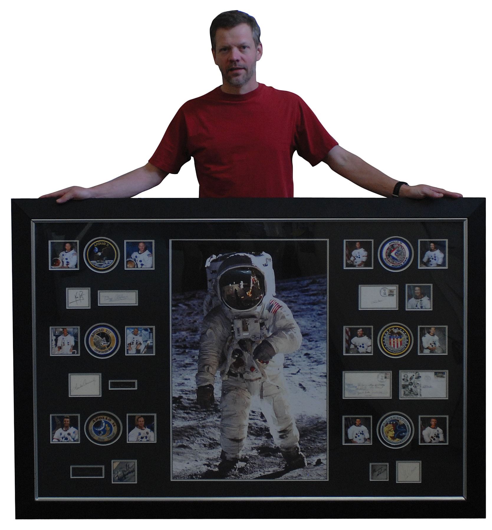 Impressively displayed complete collection of moonwalker autographs, including: ink and felt tip signatures of Neil Armstrong, Buzz Aldrin, Charles Conrad, and Gene Cernan on off-white cards; gold ink signatures of Alan Bean and Alan Shepard on black cards; felt tip signatures of Edgar Mitchell and Harrison Schmitt on matted down color photos; a small color photo of Jim Irwin signed in black felt tip; and individual commemorative covers signed in ink by Dave Scott, Charlie Duke, and John Young, with signatures of five other members of the Space Shuttle pilot panel on Young's cover. All signatures are grouped together by mission and impressively double-matted and framed with color photos of each moonwalker, their respective mission patch, and a large color poster of Buzz Aldrin on the lunar surface, to an overall size of 65 x 44. In fine condition. Oversized.