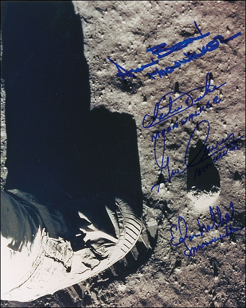 Appealing color semi-glossy 8 x 10 photo of an astronaut boot on the lunar surface, signed in blue felt tip by Alan Bean, Charlie Duke, Gene Cernan, and Edgar Mitchell, each adding “Moonwalker” beneath their signature. In fine condition, with trivial crease to lower left corner and a collector’s label to reverse.