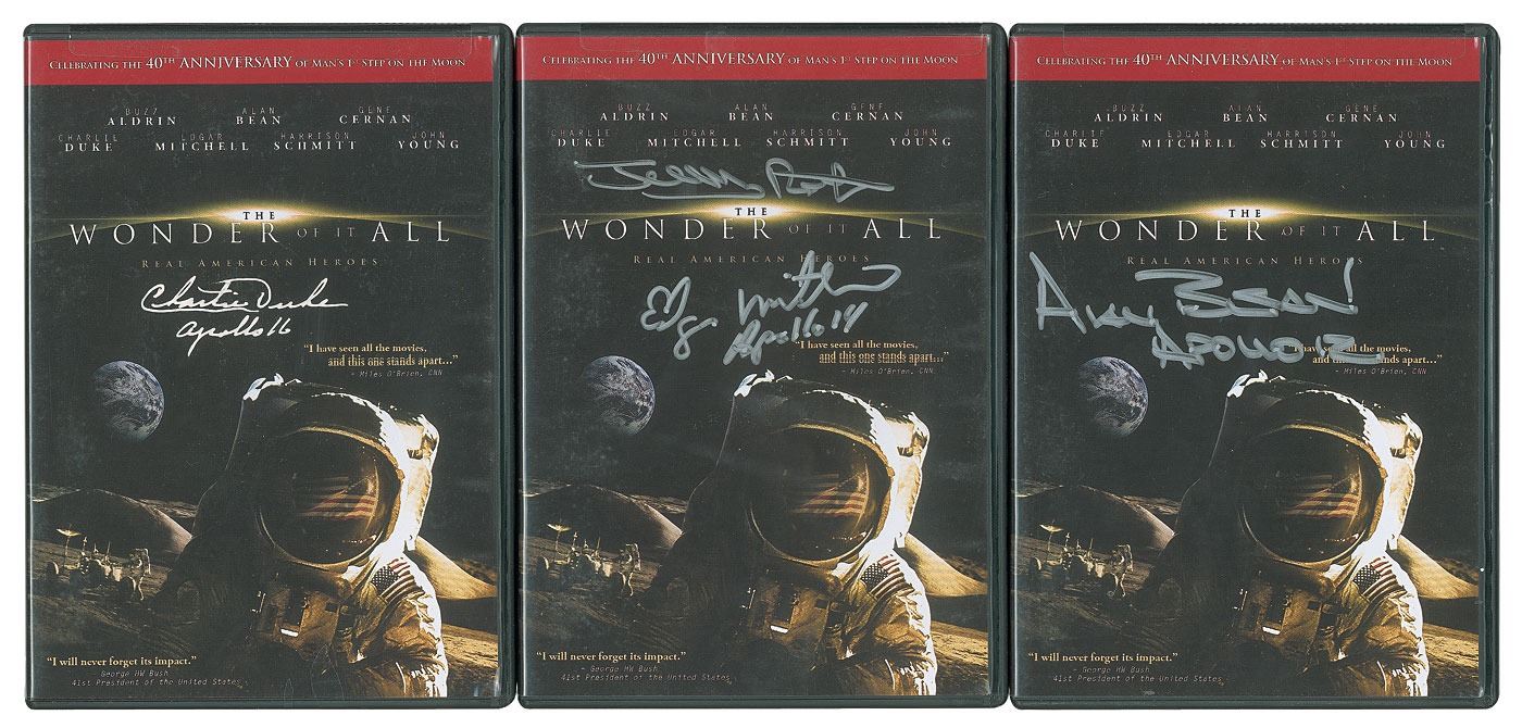 Three DVDs for the 2007 space documentary The Wonder of It All, individually signed in silver ink or white paint by a moonwalker: "Alan Bean, Apollo 12," "Edgar Mitchell, Apollo 14," and "Charlie Duke, Apollo 16." The Mitchell DVD is also signed the film's director, Jeffrey Roth. In overall fine condition. The DVD discs are included.