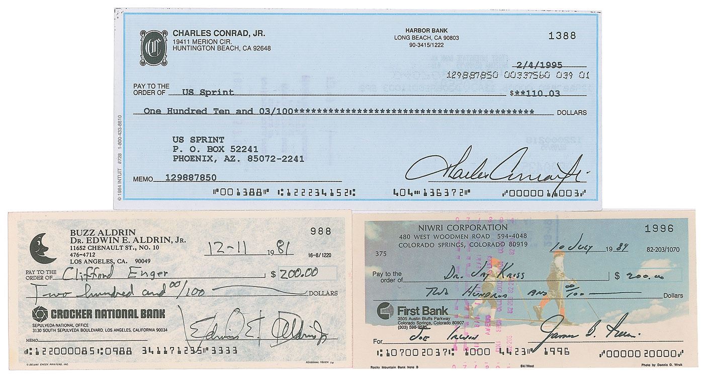 Three checks signed by moonwalkers: a personal check filled out and signed by Buzz Aldrin, "Edwin E. Aldrin, Jr.," payable to Clifford Enger for $200, December 11, 1981, marked "VOID" over his signature; a personal check filled out in type and signed by Charles Conrad, "Charles Conrad, Jr.," payable to US Sprint for $110.03, February 4, 1995; and a Niwri Corporation check filled out and signed by Jim Irwin, "James B. Irwin," payable to Dr. Jay Kress for $200, July 10, 1989, with "Joe Irwin" written in the memo field. In overall fine condition.