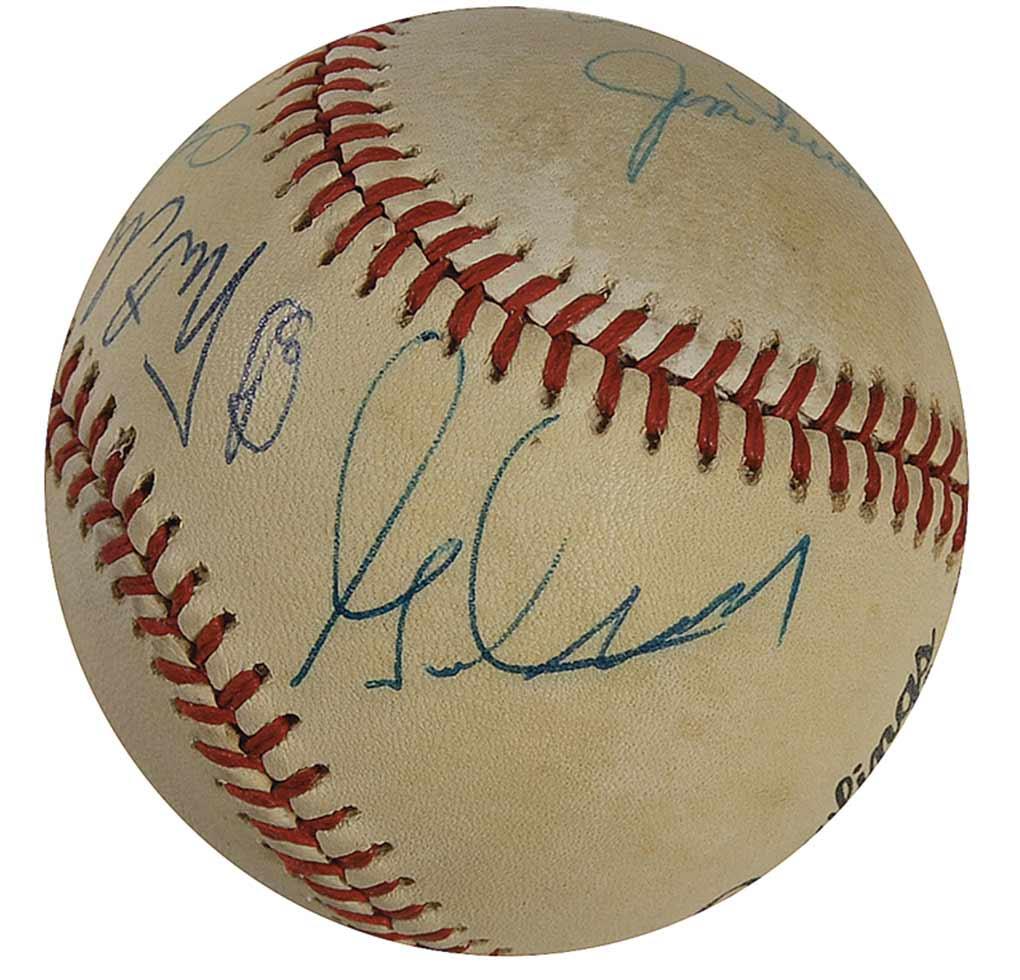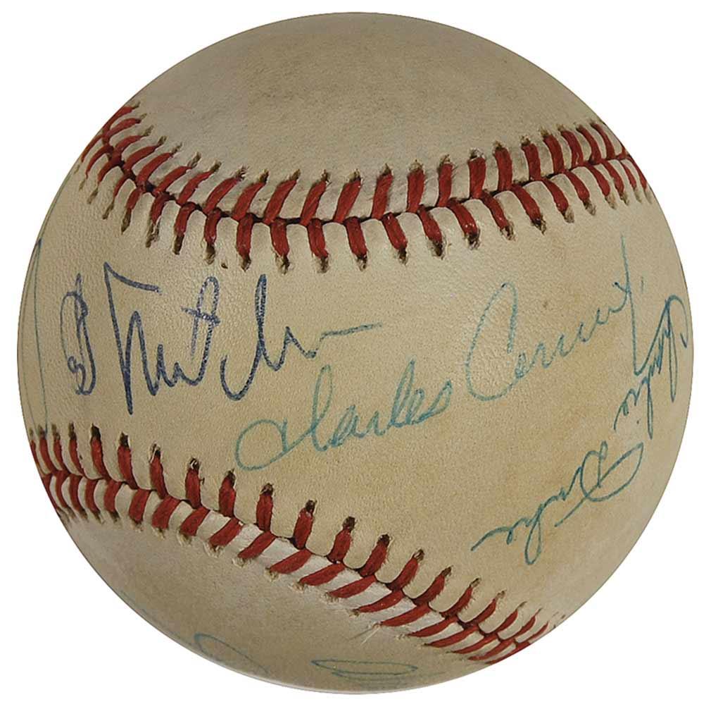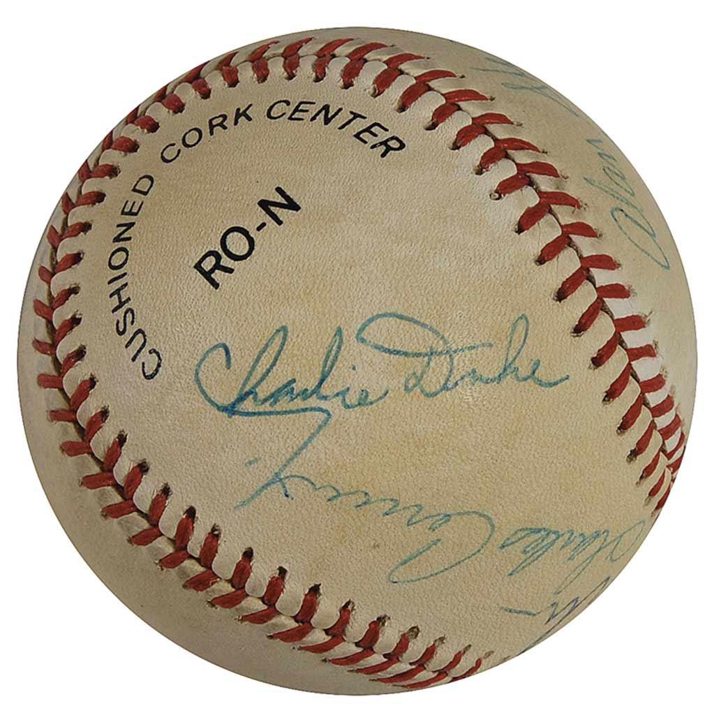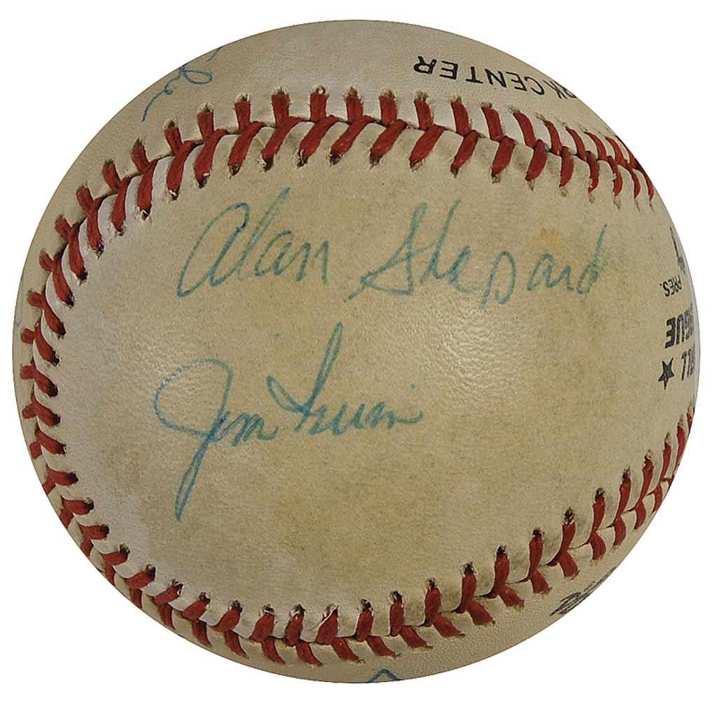 Official Rawlings National League baseball signed in blue ballpoint on the sweet spot by Edgar Mitchell, and on the side panels by Charles Conrad, Charlie Duke, Gene Cernan, Alan Shepard, and Jim Irwin. In very good condition, with even overall toning, and a bit of light soiling.