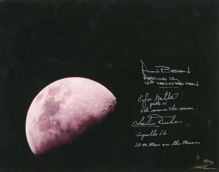 Color satin-finish 14 x 11 photo of the moon taken from space, signed in silver ink by Alan Bean, Edgar Mitchell, and Charlie Duke, each adding their Apollo missions, and their appropriate moonwalker number. Photo is affixed to an identical size board. A few light bends and creases, with a more noticeable crease to top left, otherwise fine condition. Pre-certified Scott Cornish and RRAuction COA.