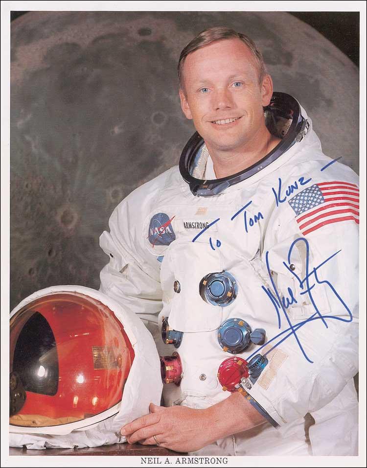 Neil Armstrong - color 8 x 10 NASA photo of Armstrong in his space suit against a lunar background, signed and inscribed in blue felt tip “To Tom Kune, Neil Armstrong.”