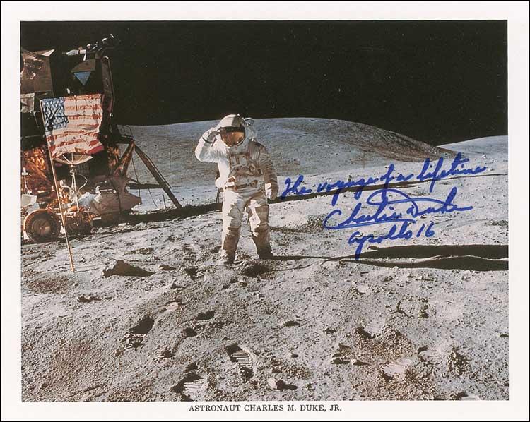 Charlie Duke - color light card-stock 10 x 8 NASA photo of Duke saluting the flag on the lunar surface, signed in blue felt tip, “The voyage of a lifetime, Charlie Duke, Apollo 16.”