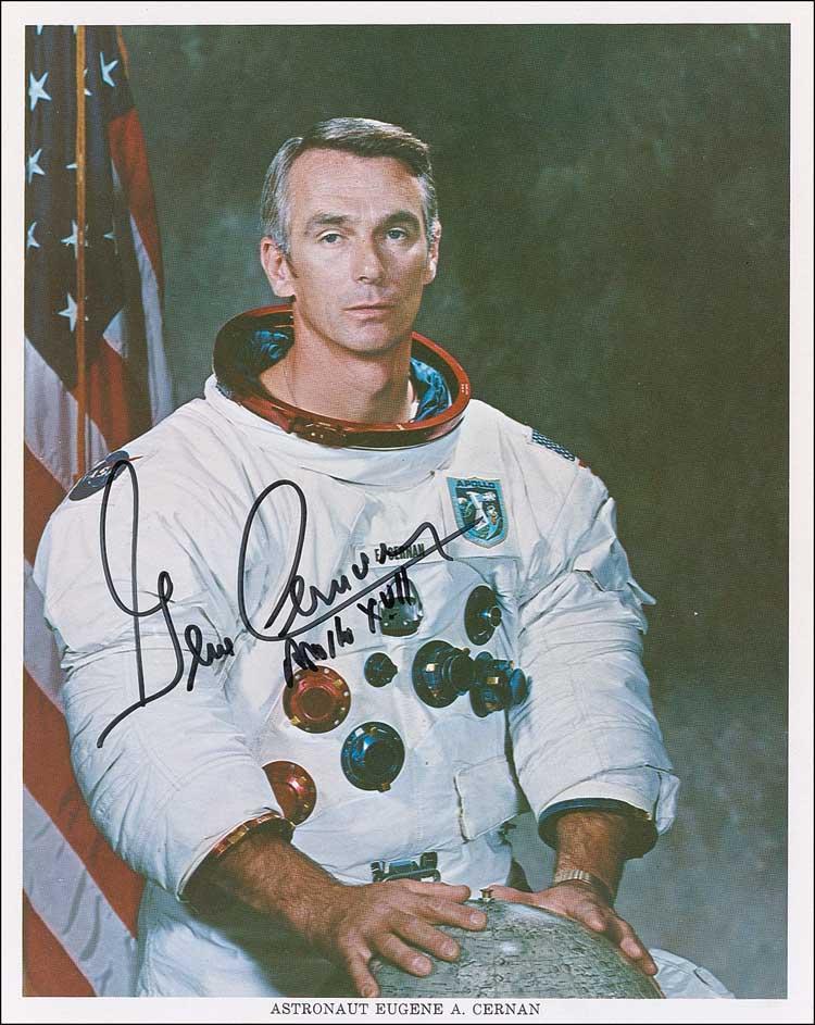 Gene Cernan - color 10 x 8 NASA photo of Cernan posing with a globe in his space suit, signed in black felt tip, “Gene Cernan, Apollo XVII.”
