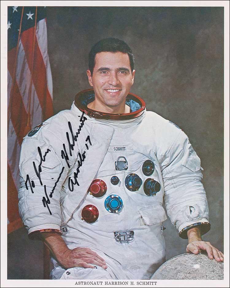 Harrison Schmitt - color 10 x 8 NASA photo of Schmitt posing with a globe in his space suit, signed and inscribed in black felt tip, “To John, Harrison H. Schmitt, Apollo 17.”