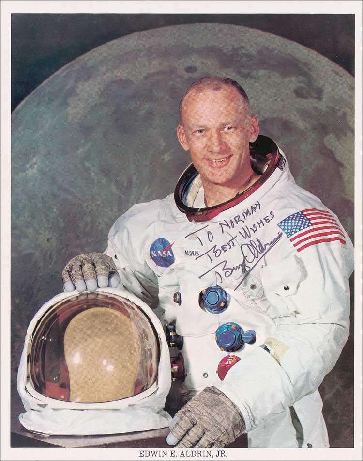 Buzz Aldrin - color 8 x 10 NASA photo of Armstrong in his space suit against a lunar background, signed and inscribed in black felt tip, “To Norman, Best Wishes, Buzz Aldrin.”
