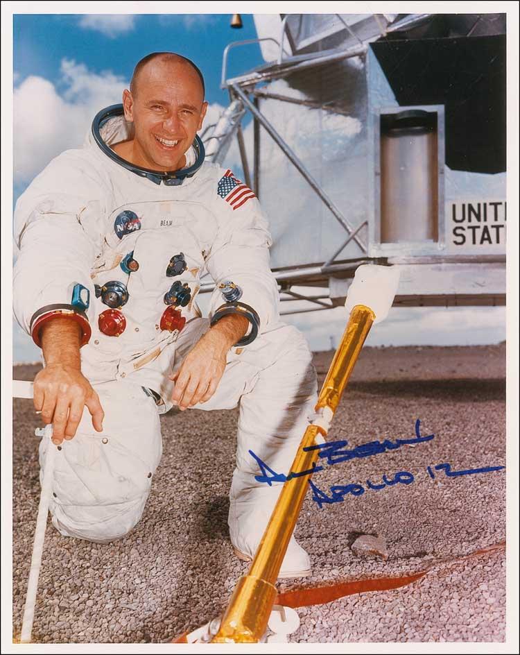 Alan Bean - color 8 x 10 satin-finish photo of Bean kneeling in front of his lunar lander, signed in blue felt tip, “Alan Bean, Apollo 12.”
