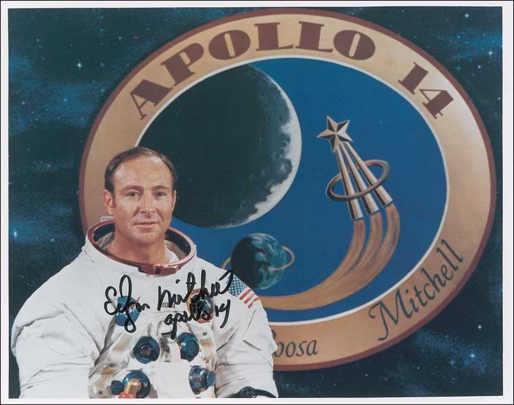 Edgar Mitchell - color satin-finish 10 x 8 photo of Mitchell posing in front of the Apollo 14 emblem signed in black felt tip, “Edgar Mitchell, Apollo 14.”