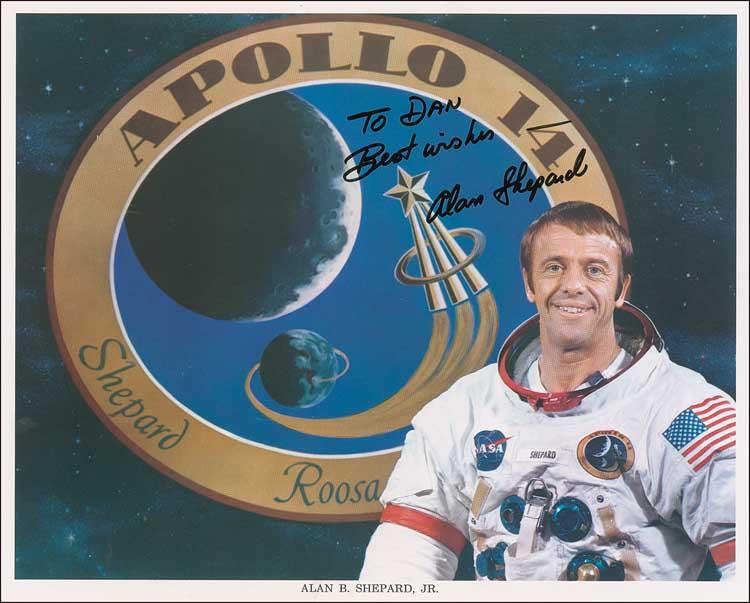 Alan Shepard - color 10 x 8 NASA photo of Shepard posing in front of the Apollo 14 emblem, signed and inscribed in black felt tip, “To Dan, Best Wishes, Alan Shepard.”