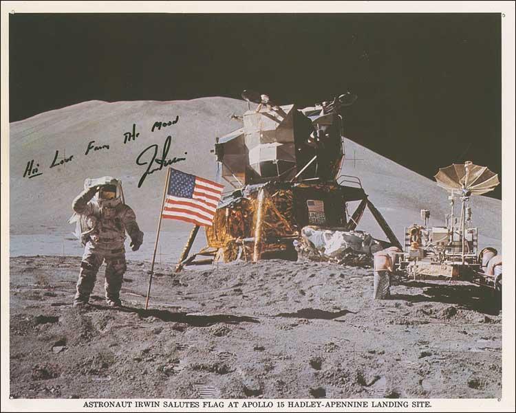 James Irwin - color 10 x 8 photo of Irwin at his landing site, signed in black felt tip, “His love from the moon, Jim Irwin.”