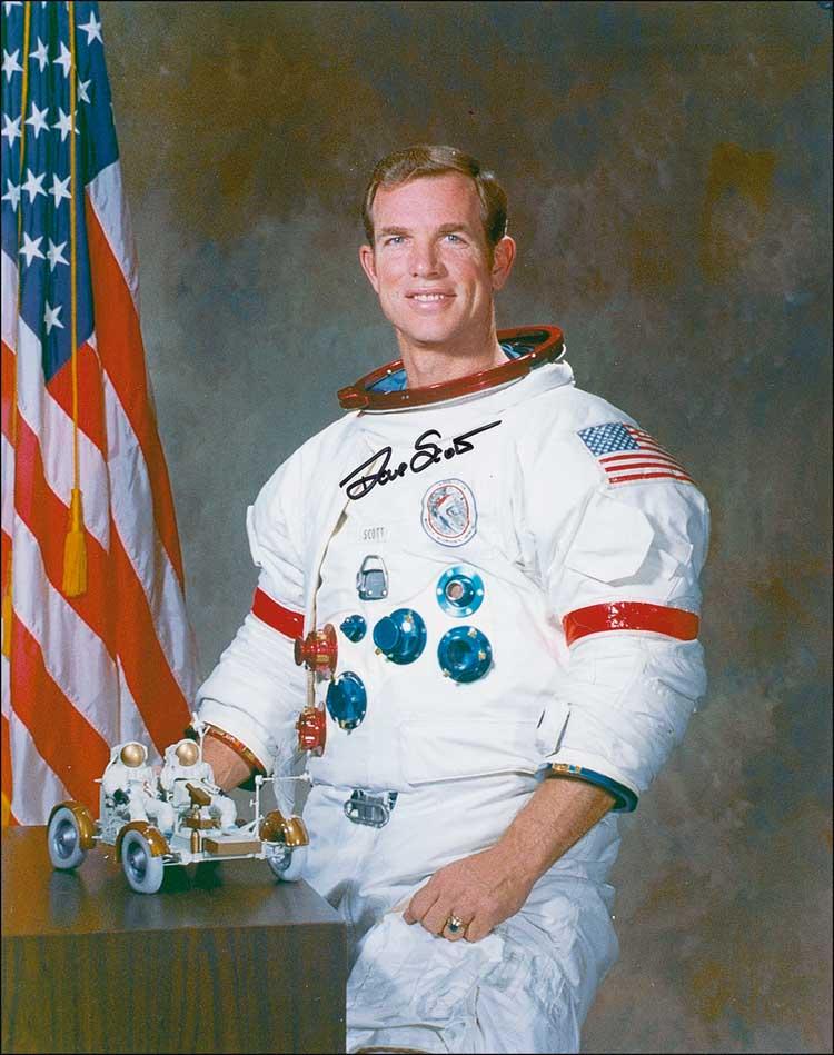 Dave Scott - color 8 x 10 glossy photo of Scott posing in his space suit, signed in black felt tip.