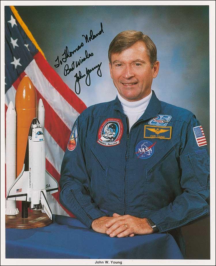 John Young - color 8 x 10 NASA photo of Young posing with a space shuttle model, signed and inscribed in black felt tip, “To Thomas Noland, Best Wishes, John Young.”