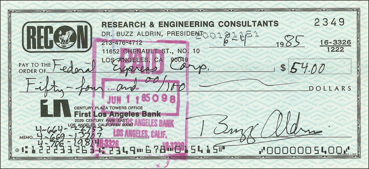 Buzz Aldrin - personal check, 6 x 2.75, filled out and signed by Aldrin, payable to Federal Express Corp. for $54.00, dated June 4, 1985