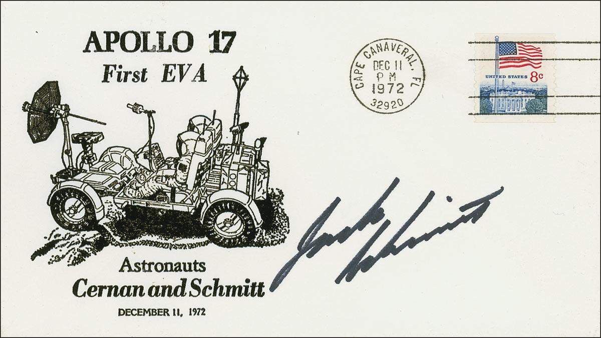 Harrison Schmitt - commemorative cover, bearing a cachet honoring Apollo 17’s first EVA, signed in black felt tip.