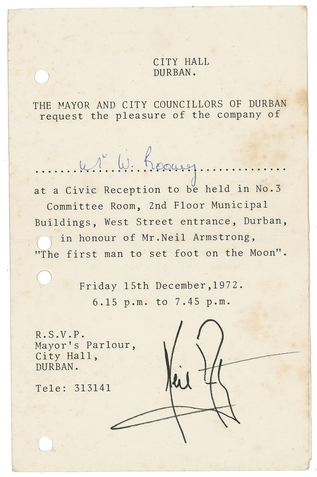 Neil Armstrong - a typed one page invitation, 5 x 7.25, for a Civic Reception in Armstrong’s honor in Durban, signed at the bottom in black felt tip by Armstrong