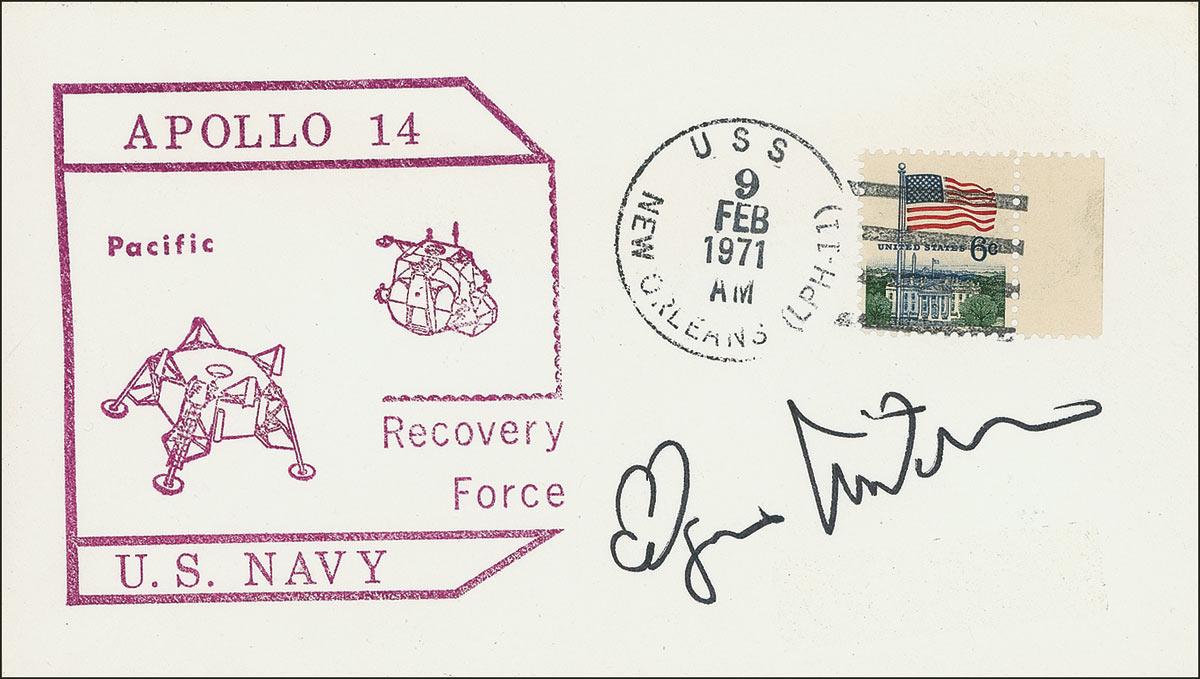 Edgar Mitchell - Apollo 14 prime recovery cover, bearing a stamped cachet honoring the naval recovery force, signed in black felt tip