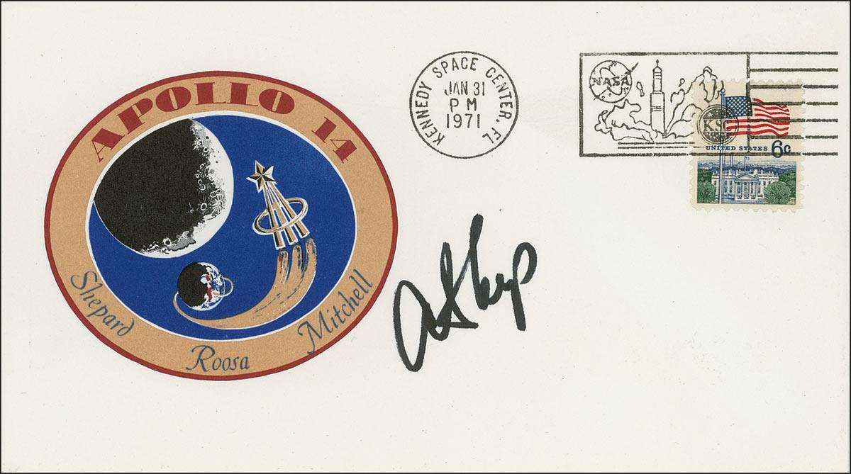 Alan Shepard - commemorative cover, bearing a color cachet of the Apollo 14 mission emblem, signed in black felt tip