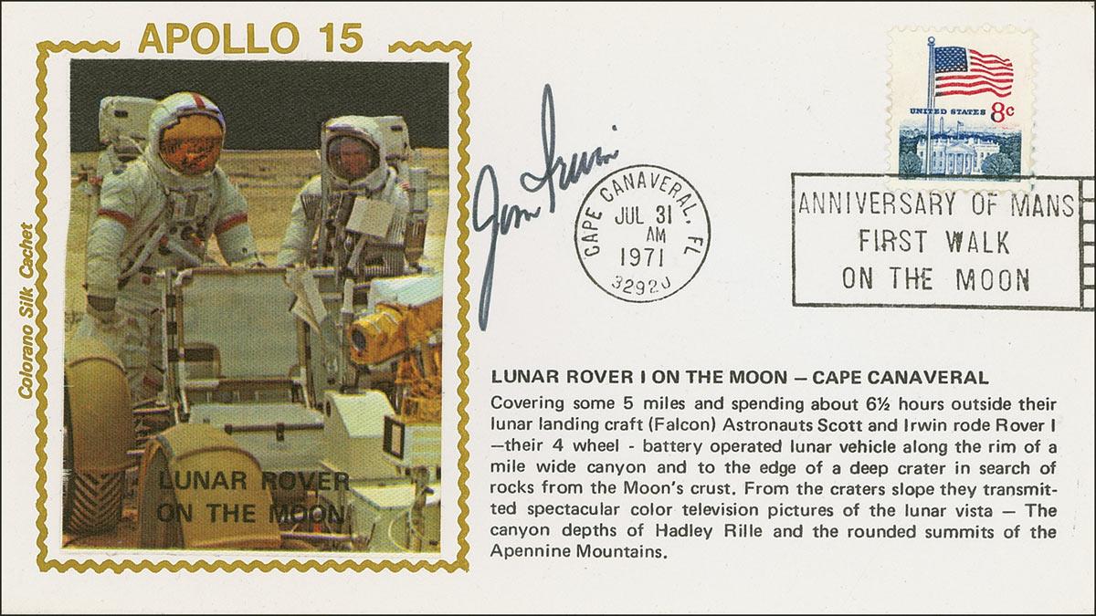 Jim Irwin - commemorative cover, bearing a color silk cachet of the lunar rover on the moon, signed in black felt tip