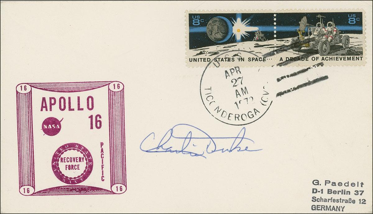 Charlie Duke - Apollo 16 prime recovery cover, bearing a stamped cachet honoring the recovery force, signed in blue ballpoint