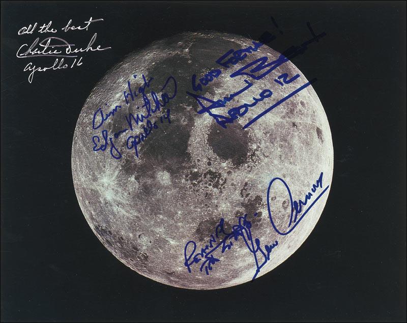 Breathtaking color glossy 10 x 8 photo of the moon, signed in blue felt tip by Edgar Mitchell, Alan Bean, and Gene Cernan, and in silver ink by Charlie Duke. In fine condition, with a few small fingerprints, and some light contrast to small portion of Bean’s signature. Pre-certified Scott Cornish and RRAuction COA.