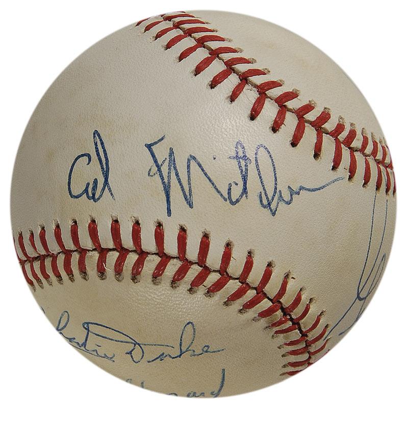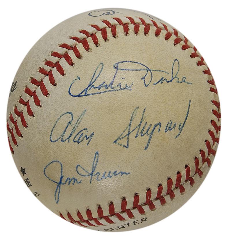 Official Rawlings National League baseball signed in blue ballpoint by Ed Mitchell (on a side panel extending onto the sweet spot), and on the side panels by Charlie Duke, Alan Shepard, Jim Irwin, Gene Cernan, and Charles Conrad. Scattered toning and soiling, otherwise fine condition. Pre-certified Scott Cornish and RRAuction COA.