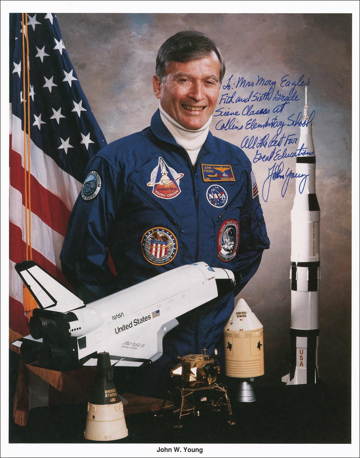 John Young - color 8 x 10 NASA photo of Young posing with several spaceship models, signed and inscribed in blue ink