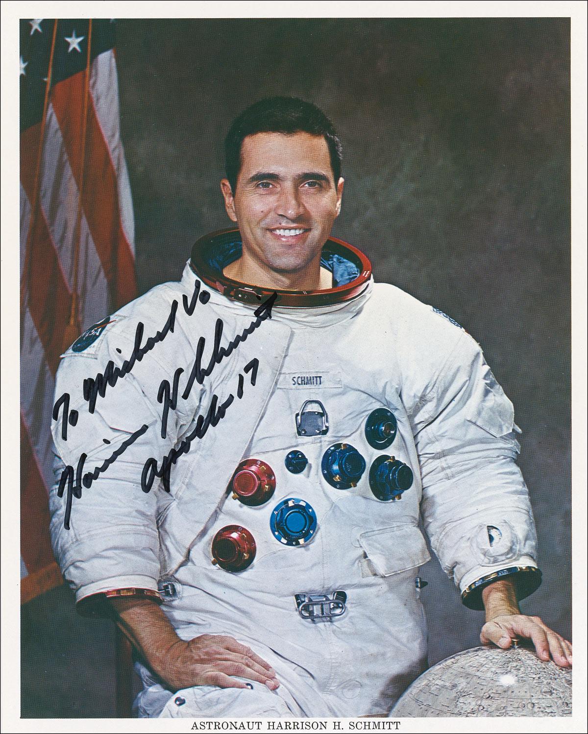 Harrison Schmitt - color 8 x 10 NASA photo of Schmitt in his white spacesuit, signed and inscribed in black felt tip
