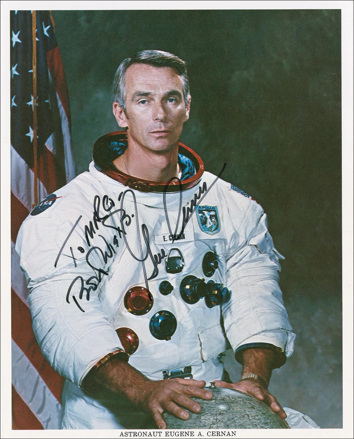 Gene Cernan - color 8 x 10 NASA photo of Cernan posing in his white spacesuit with a globe of the moon, signed and inscribed in black felt tip.