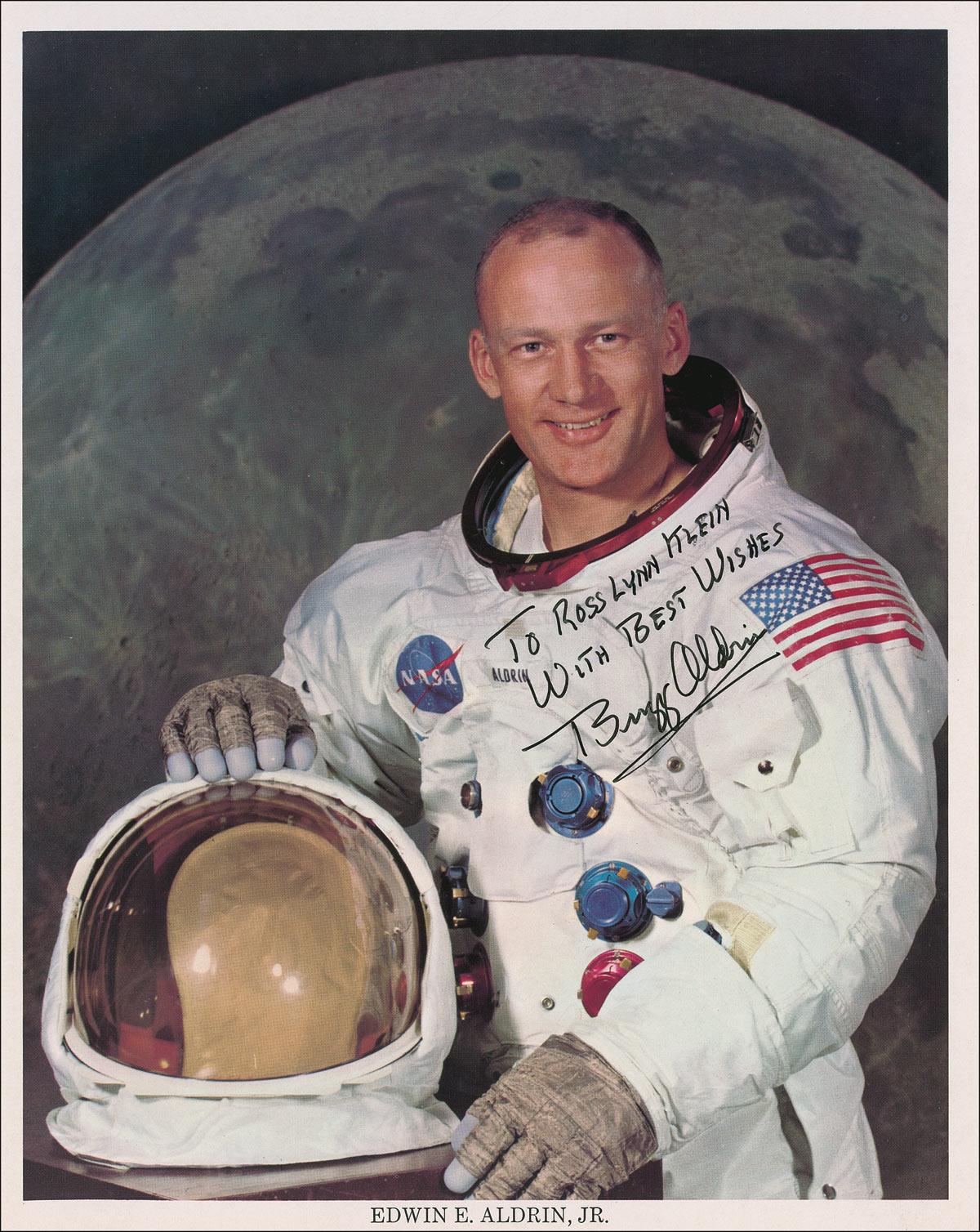 Buzz Aldrin - color 8 x 10 NASA photo of Aldrin in his white spacesuit against a lunar background, signed and inscribed in black felt tip