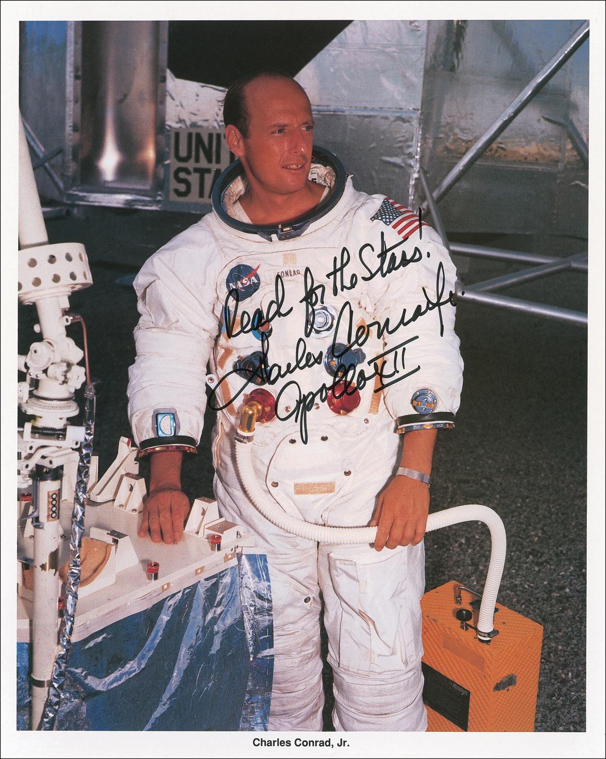 Charles Conrad - color 8 x 10 NASA photo of Conrad in his white spacesuit during training, signed in black felt tip, “Reach for the stars! Charles Conrad, Jr. Apollo XII”
