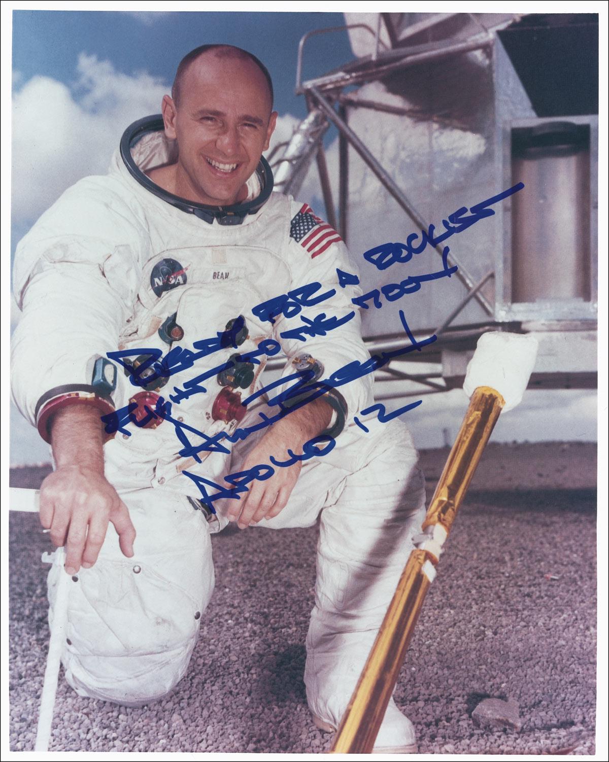 Alan Bean - color satin-finish 8 x 10 photo of Bean during training, signed in blue felt tip, “Ready for a rocket flight to the moon, Alan Bean, Apollo 12”
