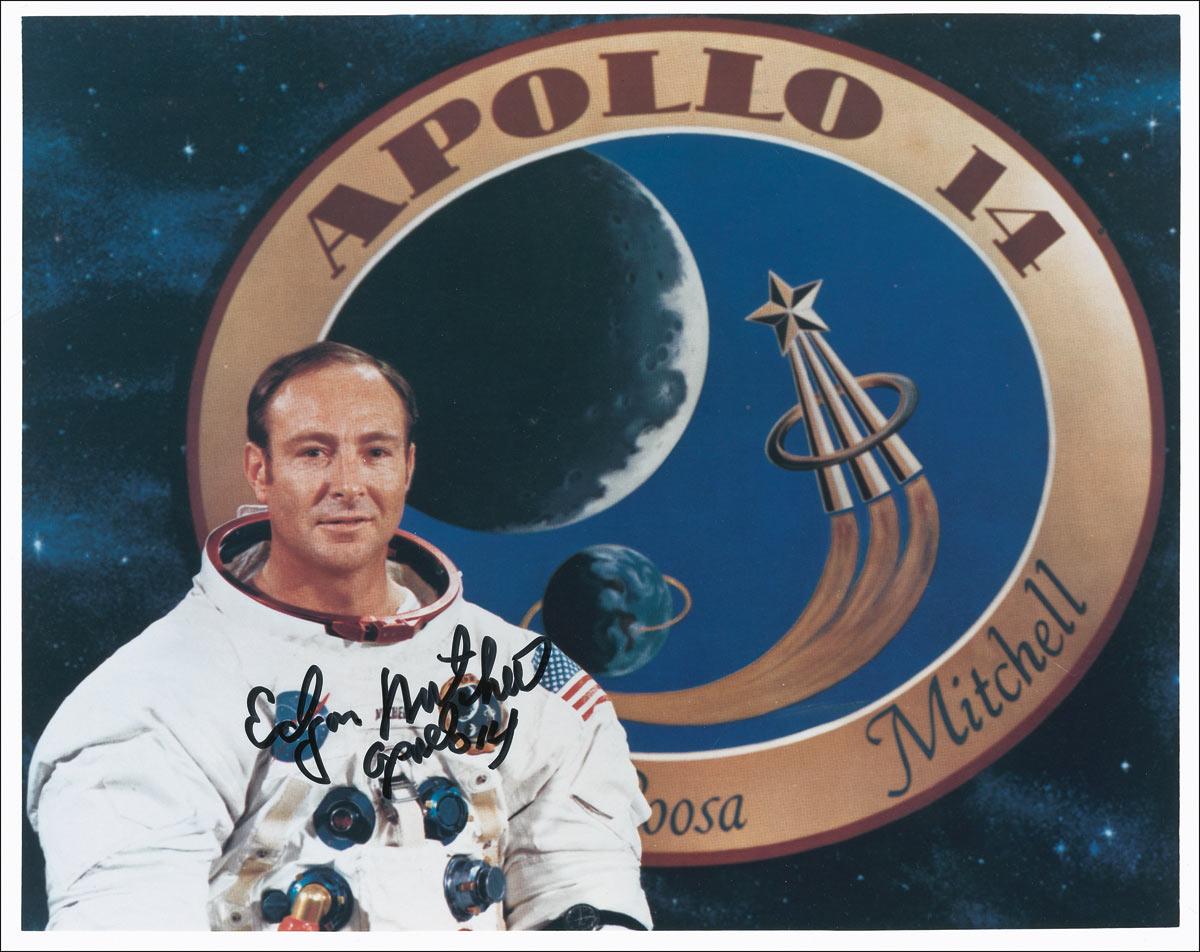 Edgar Mitchell - color satin-finish 10 x 8 photo of Mitchell posing in front of the Apollo 14 emblem in his spacesuit, signed in black felt tip