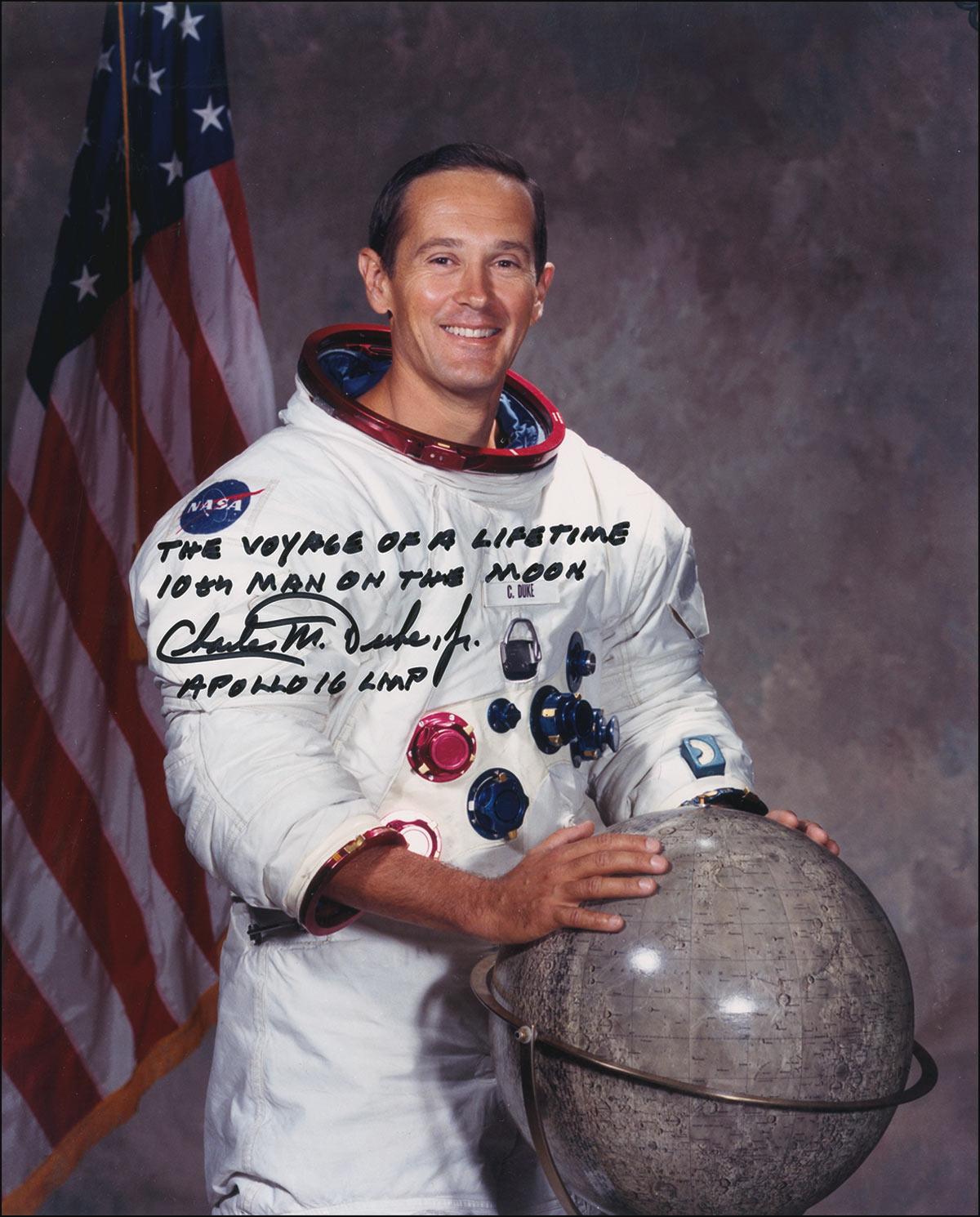 Charlie Duke - color satin-finish 8 x 10 photo of Duke posing in his spacesuit with a globe of the moon, signed in black felt tip, “The voyage of a lifetime, 10th Man on the moon, Charles M. Duke, Jr., Apollo 16 LMP”