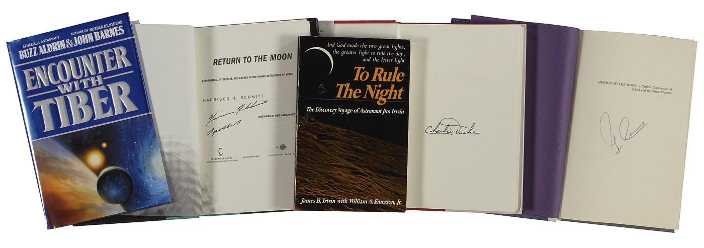 Five signed books, four hardcover and one softcover, each signed on an opening page by the respective author and moonwalker. Signers are: Buzz Aldrin (Encounter with Tiber); Gene Cernan (Mission to the Moon); Jim Irwin (To Rule the Night) (ins); Charlie Duke (Moonwalker); and Harrison Schmitt (Return to the Moon). In fine overall condition. Pre-certified Scott Cornish and RRAuction COA.