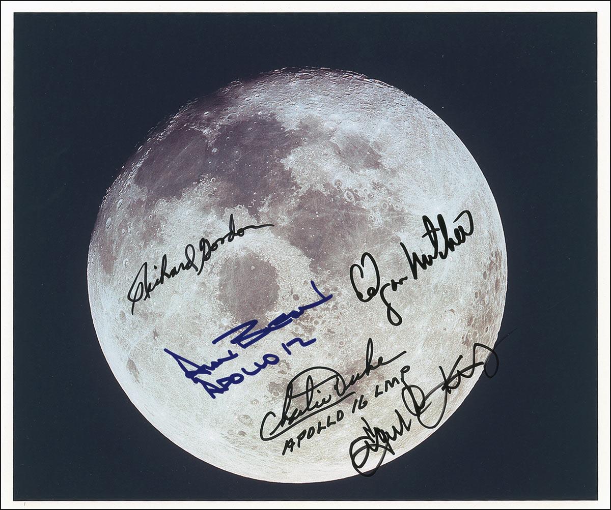 Color 10 x 8 laser print photo of the moon, signed in black felt tip by Edgar Mitchell and Charlie Duke, and in blue felt tip by Alan Bean. Photo is also signed in felt tip by astronaut Richard Gordon and flight director Gene Kranz. In very fine condition. Pre-certified Scott Cornish and RRAuction COA.