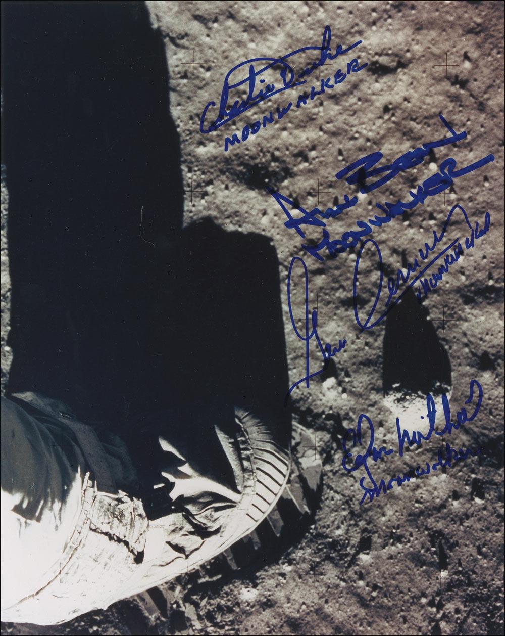 Color satin-finish 8 x 10 photo of an astronaut’s boot and footprint on the lunar surface, signed in blue felt tip by Charlie Duke, Alan Bean, Gene Cernan, and Edgar Mitchell. In fine condition. Pre-certified Scott Cornish and RRAuction COA.
