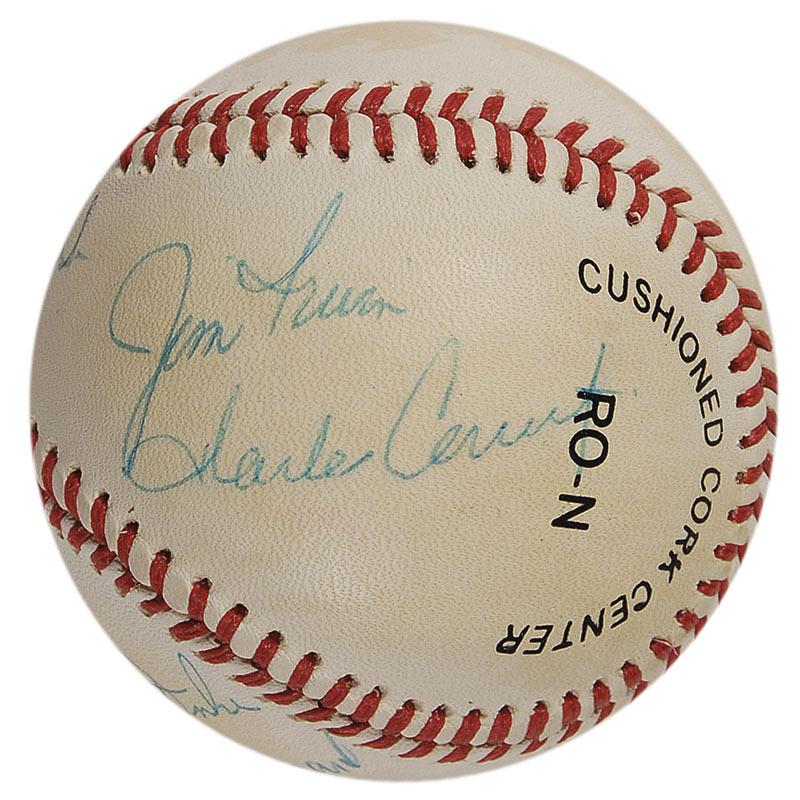Official Rawlings National League baseball signed in blue ballpoint on the sweet spot by Ed Mitchell, and on the side panels by Gene Cernan, Jim Irwin, Charlie Duke, Alan Shepard, and Charles Conrad. In very good condition, with scattered moderate toning and soiling.