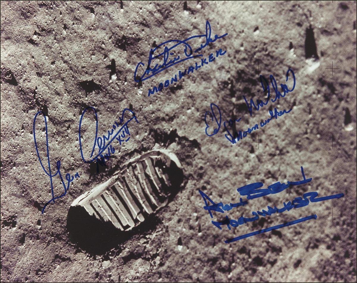 Color satin-finish 10 x 8 photo of an astronaut’s footprint on the lunar surface, signed in blue felt tip by Charlie Duke, Alan Bean, Gene Cernan, and Edgar Mitchell. In fine condition.