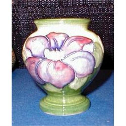 Beautiful Moorcroft vase in the Clematis pattern on green ground. This bulbous vase has two big, bold clematis blooms in shades of purple.