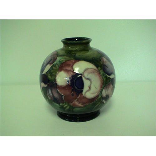 This chunky Moorcroft spherical vase is in the Anemone pattern (designed by William in 1937). Background color shades from cobalt blue at the base to green at the neck. A stunning piece with lots of decoration for its size. Bottom is signed and impressed with factory marks, and "POTTER TO HM THE QUEEN", dating it 1937 to 1949. It stands 4.25"(11cm) tall, is in great condition, no chips, cracks or restorations.