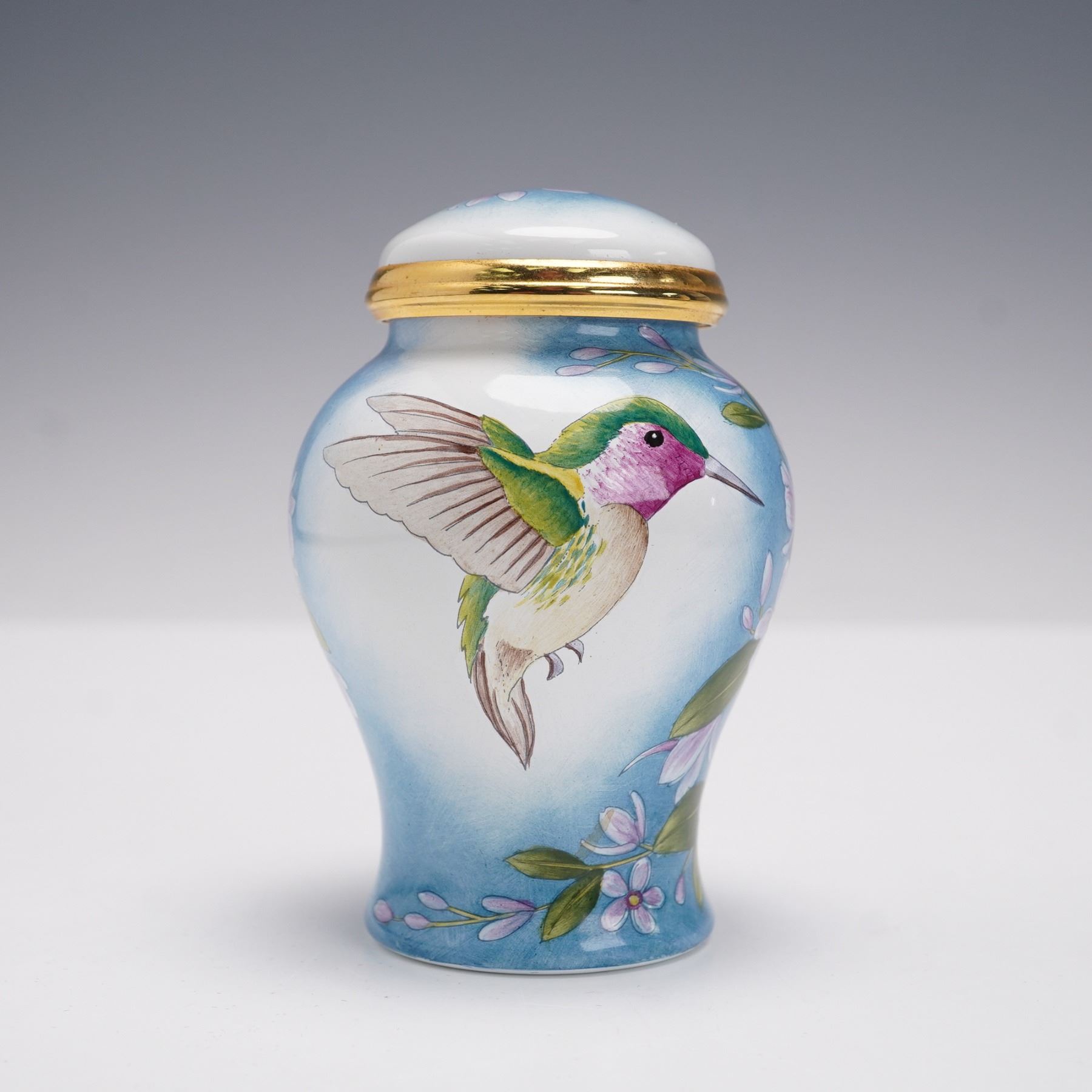 Moorcroft copper enamel lidded mini vase featuring a detailed hummingbird motif in flight among pink blossoms against a soft blue background. The vase is decorated with hand-painted flowers and foliage, highlighted with gold accents around the lid rim. Moorcroft is marked on the underside. The piece comes in the original Moorcroft presentation box with gilt border design and lettering.