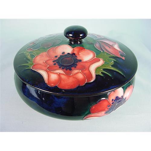 5 1/2 inch Round Covered Box ** Cobalt Blue with Poppies on the Lid ** Lid and Box are Marked ** Bottom of Box: Made in England ** Signed W. Moorcroft. Impress Potter to the Queen ** Excellent Condition