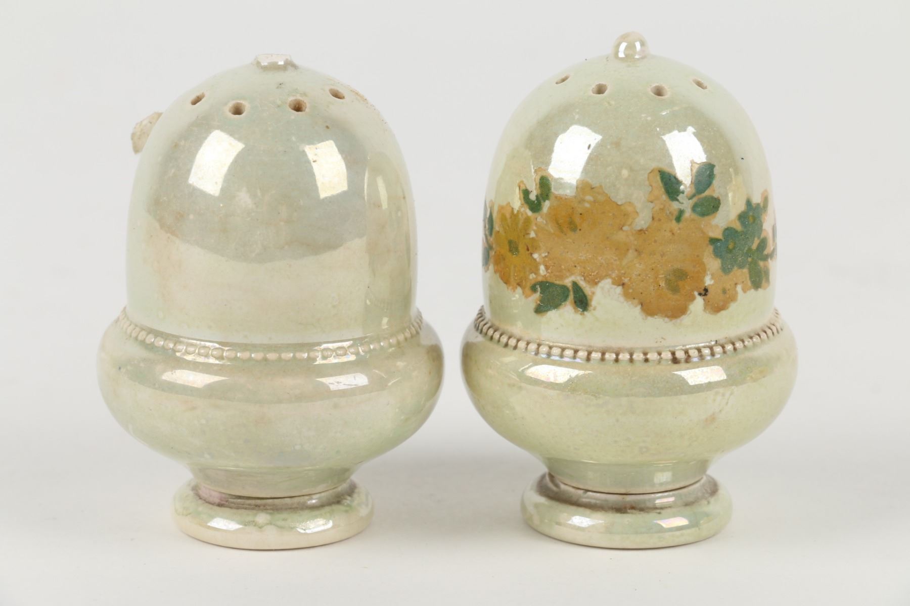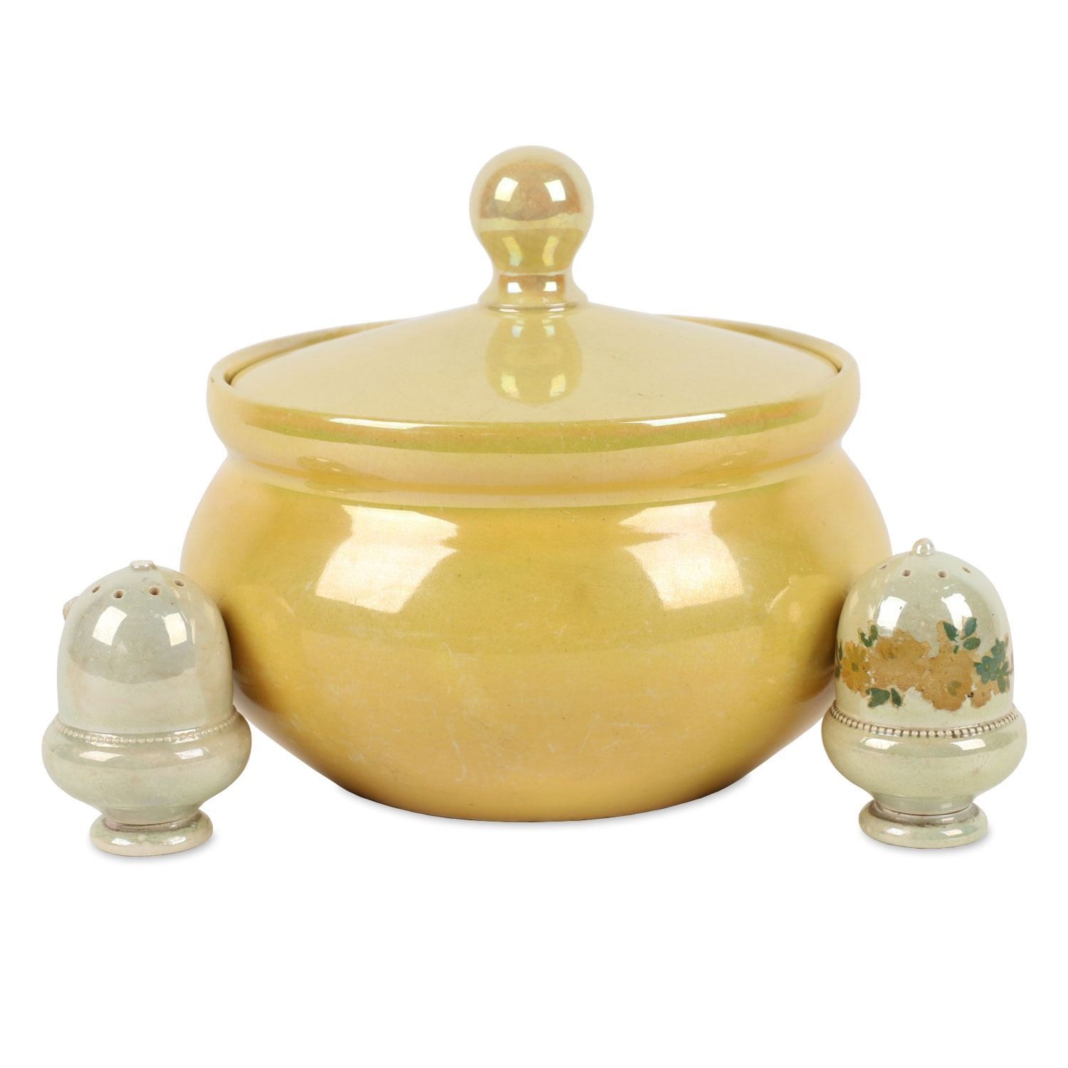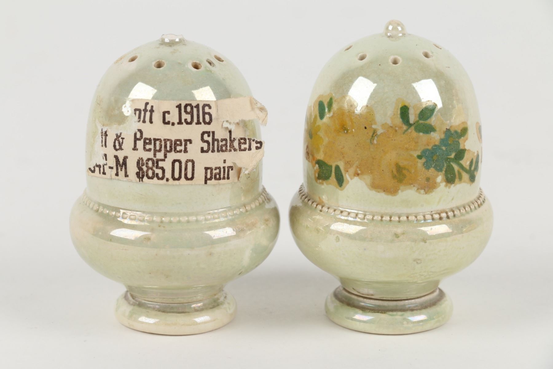 Lot 31 - Three (3) pieces. Circa 1916. English. Plain lustre glazes. All stamped "Moorcroft" on underside. 6.5" x 6.5" x 5", shakers 2.75" h. 6.5" x 6.5" x 5", shakers 2.75" h. One finial chipped at the top of one shaker. $100-200.